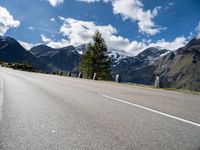 A sunny day in Europe's highlands reveals a landscape of grass, trees, and rolling glacial mountain terrain, with a tar road cutting through the natural environment.