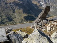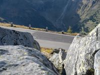 rocks and boulders at the side of a mountain road with snow capped mountains in the distance