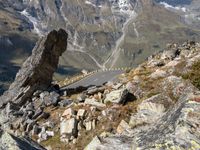 a large rock by the road with snow capped mountains in the background at the bottom of the picture