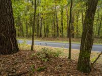 A lush, deciduous vegetation set against a road surface of asphalt and tar, the autumn landscape of Berlin, Germany reveals a nature-filled plant community of trees, shrubs, and groundcover. Sunlight filters through the woody plants, casting shade over the terrestrial plants and providing a pleasant atmosphere for the infrastructure and thoroughfare nearby.
