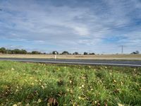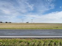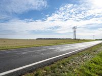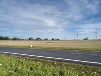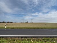 A view of a rural landscape near Berlin, Germany, featuring a tireless bicycle wheel, a field of lush grass, a tar road surface, and a vast sky with a cumulus cloud and overhead power lines. The natural environment, combined with the autumn colors, creates a peaceful scene in the heart of Europe.