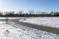 A high road covered in snow winds through a beautiful autumn landscape in Toronto, Canada under a clear sky with the sun visible.