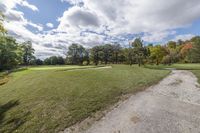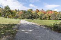 A scenic view of an autumn path in a Toronto park, surrounded by lush vegetation and towering deciduous trees.