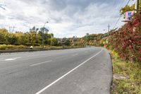an empty highway with signs on both sides and autumn trees in the background as well