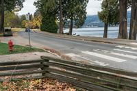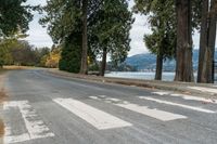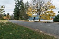 A scenic autumn road lined with trees in a residential area of Vancouver, Canada under a grey sky.