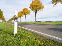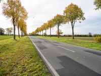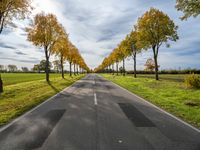 A grey sky looms over the lush natural environment of Berlin, Germany, in autumn. The landscape includes vegetation, woody plants, leaves, grass, and flowers. An incidental person is seen in the profile of the road, with asphalt and tar providing a smooth surface for the thoroughfare. Sunlight provides a glimmer of light through the gloom.