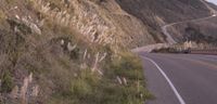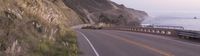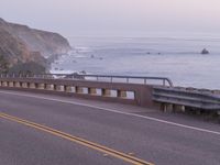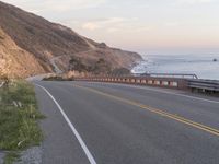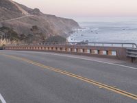 The Pacific Coast Highway winds its way across California, USA, over a concrete bridge and through a mountain pass, as the early morning sky is illuminated by the rising sun. The stunning coastal landscape is dotted with trees, vegetation, and Armco barriers, while the horizon is filled with contrails and a clear sky.