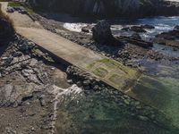 the aerial view of an empty concrete area near the ocean, on a rocky beach