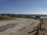 A beautiful day in Portugal along the coast, featuring an armco barrier, trees, grass, and a mountain landform in the background. The sun is shining on the asphalt road, providing a hard shadow on the grass surface and clear blue skies with a few clouds in the horizon.