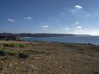 A picturesque landscape of the Portuguese coast, with rolling mountains and hilly terrain, lush vegetation, and a clear blue sky with cumulus clouds above the azure lake. Natural resources such as the sun, water, and sand are visible in the sunny open space.