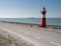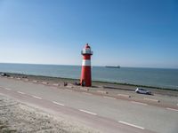 A calm day in the Netherlands gives way to an azure coastline. The terrain is a mix of asphalt roads, shorelines, and a lake, with a lighthouse standing tall in the background. The natural environment is populated by vehicles and bicycles, all beneath a clear sky.