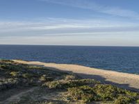 A straight road of sand and gravel winds through a European mountain landscape of grass, beach, and vegetation. The azure bank of the ocean runs in the background under a clear sky, and sunlight glints off the horizon of the water.