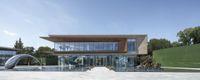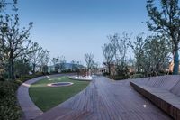 A stunning view of the residential villa at dawn in a suburban area of China. The open space, surrounded by nature, is filled with light and features a wooden path leading to the house. The clear sky and artificial lights create a serene and emotional ambience. Located in the city of Chongqing, this villa showcases the elegant interior design and wood floor surface. It is a perfect place for recreational activities and offers a peaceful retreat from the bustling city life.