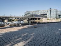 A profile of Berlin's modern architecture and urban design, with a clear sky above a cobblestone road and jetty leading to a harbor landing.