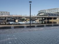 the walkway on the banks of the river, and the city in the background is very tall, with a bridge