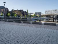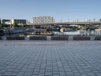 a brick paved walkway with a bridge and a river in the background next to a cement block wall
