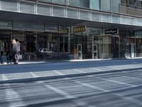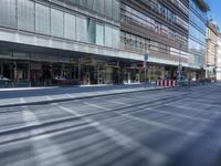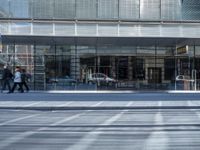 A snapshot of the urban infrastructure of Berlin, Deutschland, Europe. Pedestrians cross a busy road lined with modern architecture, glass walls, and metal facades outside a mixed-use office building and storefronts. A tourist captures the reflection of the cityscape in the glass wall of a shop.