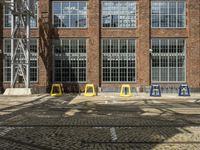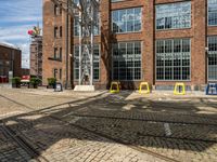 A cobblestone walkway leads to a warehouse in the mixed-use industrial Berlin neighborhood. Buildings of yellow brick and steel with wood beams, concrete and iron columns, and flooring along the courtyard are all part of the city's architectural art district and a popular tourist attraction.