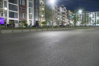 A modern residential neighborhood in Berlin, Germany illuminated by street lights and the artificial light of buildings. Urban infrastructure including roads, curbs and vegetation can be seen in the tints and shades of the night.