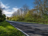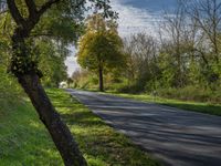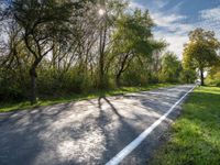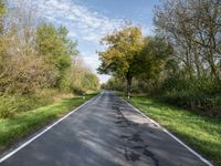 A straight down the road view of a lush vegetation landscape in Berlin, Germany on a sunny autumn day. A mix of grass, shrubs, trees and a road surface with asphalt, tar and wood extending into the horizon.