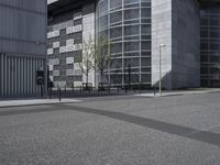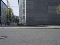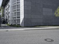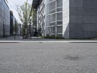 A snapshot of the modern architecture and urban design of Europe's metropolitan area of Berlin, Germany. The cityscape features a mix of office buildings, residential areas, and other public spaces, with roads, asphalt, grass, trees, and concrete in the foreground. This is a view of the city's business district on a sunny day.