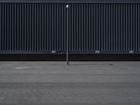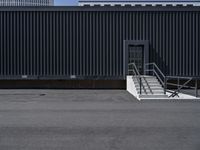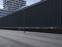 An urban view of Berlin's downtown business district, featuring a modern office building with a warehouse and shipping container in the background, a courtyard and a concrete walkway, and a variety of infrastructure and urban design elements.