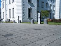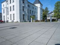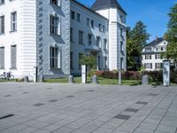 The financial district of Berlin is a mix of classic and modern architecture, with a charging station and parking lot in the foreground, under a clear sky with hard shadows.