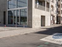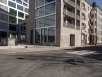 A view of the modern architecture and urban design of the Berlin business district on a clear day. The cobblestone driveway leads to an open space surrounded by asphalt, concrete and walls of residential and office buildings.