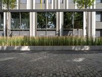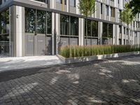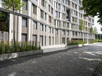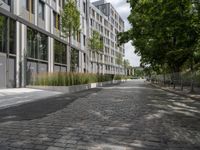 The modern and classic architecture of Berlin's business district are juxtaposed in this profile view of an office building, museum, open space and metal wall on a cobble stone surface, with a cloudy day above.