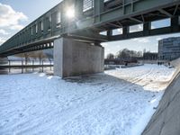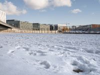 An urban design of business buildings, roads and bridges in the city of Berlin, with a river, open space and clouds visible in the sunny day with straight down the road and hard shadows in the profile.