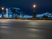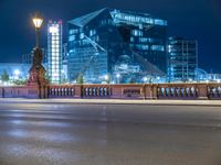 An aerial view of Berlin, Germany, with its modern architecture and urban design illuminated by artificial and street lights in the city's financial district. Europe's largest business district is a bustling hub of activity even after dark.