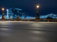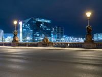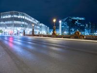 The modern architecture and urban design of the business district in Berlin, Germany, is illuminated by artificial lights and street lamps against a dark asphalt road in the European city at night.