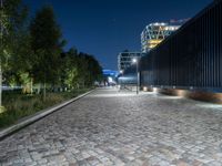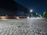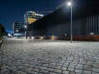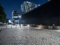 A night view of Berlin featuring a modern high-rise building, cobblestone roads, and electric street lights illuminating the cityscape.