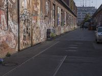 a brick building with lots of graffiti on it and cars parked near the building with windows