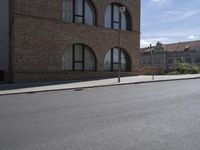 A view of a modern architecture building in the city of Berlin, Germany, with a clear sky, a curbed asphalt road, brick facade, trees, and a warehouse in the background. The bustling city life of Europe's business district is on full display.