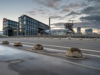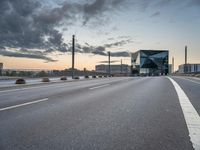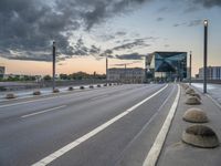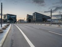 The dawn light illuminates the modern architecture in Berlin, Germany, with a business district skyline, a financial district, high-rise buildings, urban infrastructure and roads, and a public space with vegetation and trees. A shoulder of asphalt, tar, and a street light line the straight road down the horizon, creating a dramatic cityscape of the urban design and city life of Europe.