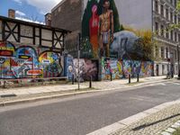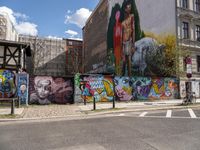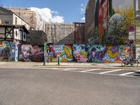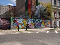 A view of the vibrant city of Berlin, Germany, with its classic architecture, urban design, graffiti art, and clear sky. The residential building facade is highlighted by a road surface, bicycle, horse, and vegetation, while the grey tints and shades of the paint, font, and line provide a unique urban look.
