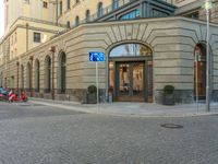 a picture of the entrance to a building in a city street area with two motorcycles in front of the entrance