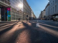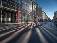 Immerse yourself in Berlin's vibrant city life and modern European architecture. The bustling business district is a showcase of innovative office buildings and sleek urban design. Clear skies cast hard shadows on the asphalt roads, creating a striking contrast against the contemporary skyline. Walk one quarter of the city to discover abstract reflections and profiles that define Berlin's unique charm.