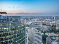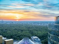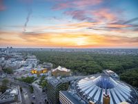 Panoramic view of Berlin, Germany, at dawn. The city skyline with its high-rise buildings and metropolitan area is illuminated by the warm sunlight. Potsdamer Platz, a popular tourist attraction, can be seen in the foreground. The contrast of nature and urban landscape creates a stunning scenery.