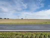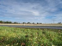 A rural landscape of the fields in Berlin, Germany in autumn, with a tar road, lush vegetation, trees, and a bicycle wheel covered in flowers in the foreground.
