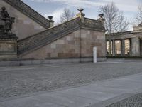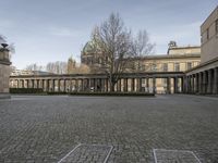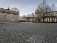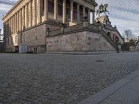 A bustling cityscape of Berlin, Germany with the Alte Nationalgalerie museum in the foreground. Classic architecture, cobblestone roads, and tree-lined public spaces give the iconic city its unique urban design. Europe's lively city life can be seen in the vibrant facades, open spaces, and low profile estates.
