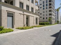 A clear day in Berlin, Europe, with a cobblestone road and a residential area featuring a modern high-rise condominium, trees and shrubs, and a manhole cover providing interesting textures and shades of grey to the brickwork.