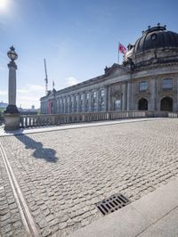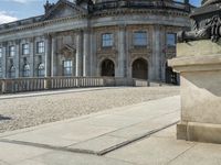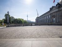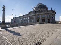 A view of Berlin, Germany's cityscape with its classical architecture and monuments, including palaces, mansions, domes, and sculptures. The cobblestone roads, concrete surfaces, and clear sky make for an ideal vacation spot. Tourists flock to the city to explore its stunning public spaces, real estate, and urban design.