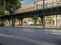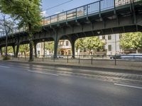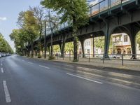 a road with parked cars is shown under an overpass on the bridge on which there are cars that are driving down the street