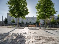 A profile view of a sunny day in Berlin, Germany. The cobble stone street leads to a jetty and pier, providing a scenic view of the urban design and city life of Europe.