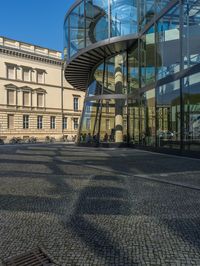In the heart of Berlin, modern architecture meets classic cobblestone streets under the clear European sky. Glass walls cast intricate shadows on the urban landscape, framing museums and open spaces. The city's design showcases a blend of old-world charm and contemporary structures, with walls and surfaces playing with light and shadow. From pavers to hard shadows, Berlin's urban design captivates visitors with its glassy allure.