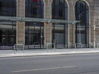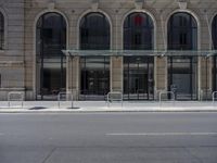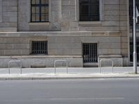 there is a street lined with stone barriers next to a building and there are no bikes or people