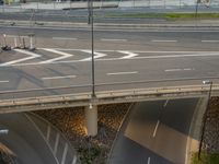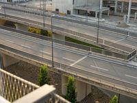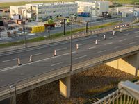 A view of Berlin, Germany showcasing its modern architecture at dawn with a road and asphalt, featuring a bridge with steel handrail and a high line infrastructure.