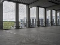 A view of the modern architecture and urban design of Berlin, Germany on a cloudy day. Concrete streets and a parking deck provide an open space in the city.